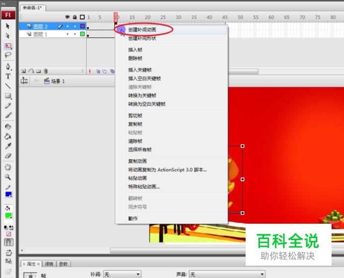 选择“图层 2”的任意一帧,右击执行“创建补间动画”,为其创建补间动画。