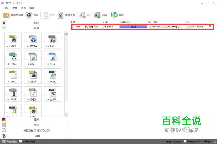 最后点击上排的开始按钮,等到文件转换,转换成功后电脑会发出提示音,并且显示100%,则表示转换完成,打开任意播放器就可以播放啦