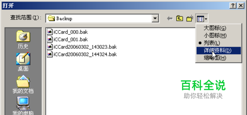 点击用户指定文件后,会显示安装目录下backup下的备份文件。点如下图的“查看”菜单――详细资料,可以详细列出每个备份文件的详细信息。
