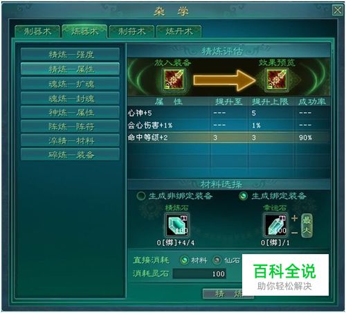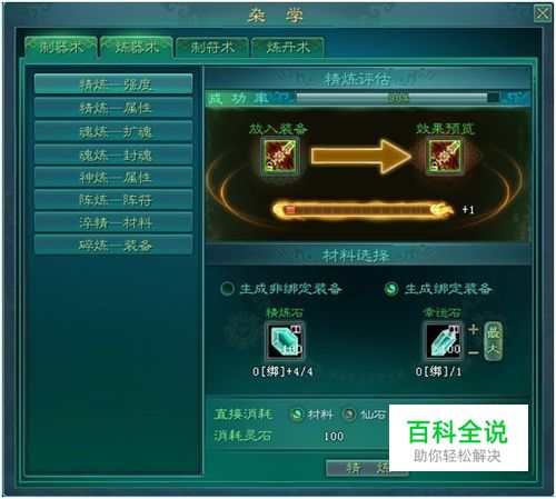 精炼--属性 可以精练的属性为:强化属性、绑定属性、附加属性。 精练装备的属性,需要消耗金钱和精炼石,可加入幸运石提升成功率,根据属性档次而定,属性档次越高可增加成功率越大。档次越高,幸运石头提升几率越低。不同境界需要的装备,对应不同阶段的精炼石和幸运石。 精炼属性可提升当前值至上限值。 精炼属性成功,材料消耗,属性提升为下一档次。 精炼属性失败,材料消耗,属性档次不变。