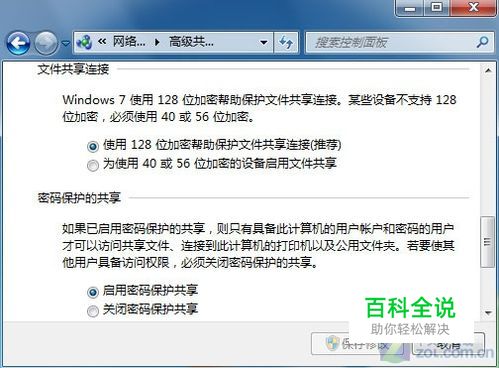通常情况下,如果您已经确认当前系统已经启用“网络发现”和“文件和打印机共享”,并且已经关闭了“密码保护的共享”。(在“网络和共享中心→高级共享设置”中查看),但在互访共享文件时,仍无法正常访问,这很可能是由于非Windows 7版本的系统不支持128位加密。