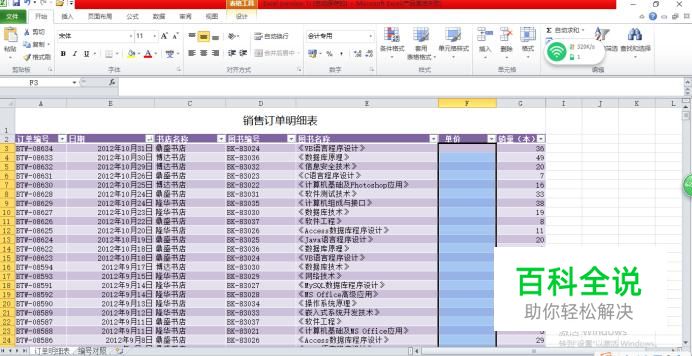 点击右下角“订单明细表”,将鼠标放在“F3”单元格,左键单击,在单元格中输入“=VLOOKUP([@图书编号],A3:C19,3,0)”,如图