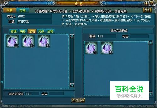 2、创建交易:输入交易人和主题、添加交易物品、输入交易金额(铜钱或元宝),最后发送交易。