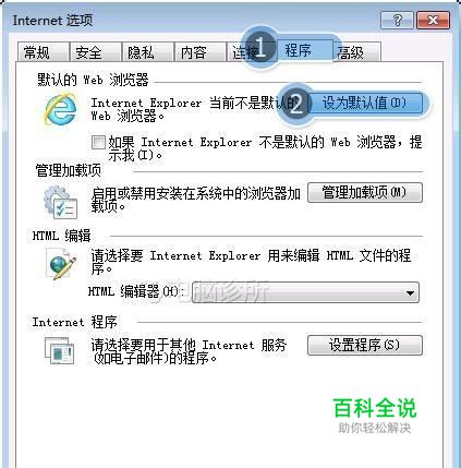 重置完成后,再次点击【设置】→【Internet选项(O)】→点击【程序】→【设为默认值(D)】→点击【确定】: