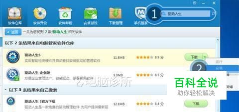 打开【电脑管家】→【软件管理】→在搜索框中输入”驱动人生”,按键盘【Enter】(回车)键→找到驱动人生,点击下箭头,选择【安装】(已经安装驱动人生或驱动精灵的用户不需要此步):