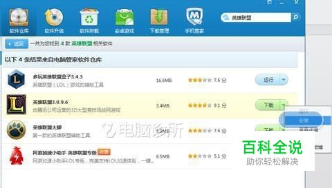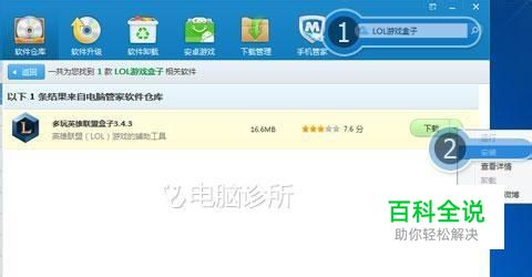 打开【电脑管家】→【软件管理】→在搜索框中输入”LOL游戏盒子”,按键盘【Enter】(回车)键→找到LOL游戏盒子,点击下箭头,选择【安装】(已安装LOL盒子的用户不需要此步):