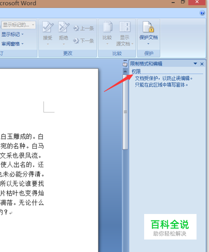 文档解锁分两种可能,一种知道密码的,一种不知道密码的。对于知道密码的文档,解锁比较简单,我们先来看看知道密码的。选择审阅菜单下的保护文档按钮,点击限制格式和编辑命令,按下图操作