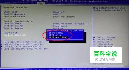可以看到有“LEGACY only”、“UEFI only”和“UEFI and LEGACY”三种选项,若是单一的UEFI启动环境,选择“UEFI only”即可;若想支持UEFI,又想支持传统BIOS启动,选择“UEFI and LEGACY”即可。
