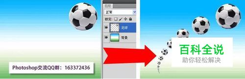 如下面截图左边的图像,有两个图层:背景和足球。现在的任务是将足球进行再制之后,实现右图所示的效果,右边再制的效果是再制的足球比原始足球略小一些,且位置稍微倾斜,使之足球逐渐变小,直到肉眼看不见。