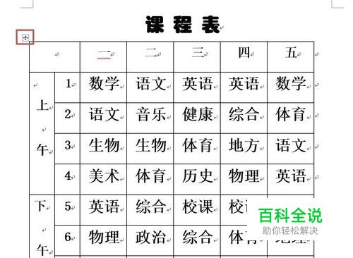 选中整个表格或光标定位到任意单元格中。这里以选中整个表格为例,鼠标放在表格上,左上角会显示表格控制柄,单击左上角控制柄上,会选中表格。