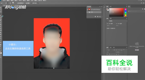点击左侧的快速选择工具,在图中将人像选中,使用快捷键ctrl+j,将人像分离。