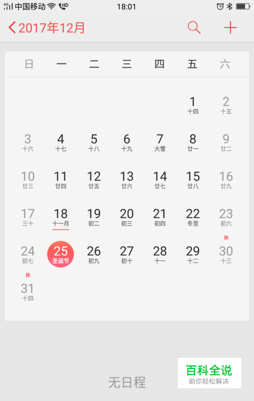 第二步,我们点击下这个图标,即可进入到日历这个软件界面里面。我们可以看到,在最左上端的那个位置有黄色字体显示的是年和月。比如现在是217年12月。另外可以看到中间被圆形的黄色填注的是代表今天的日期,12月25号。然后,用大的数字黑色加粗的数字的是代表的是公历日期。在公历日期下方用前黑涩颜色标注的日期代表的就是农历了。