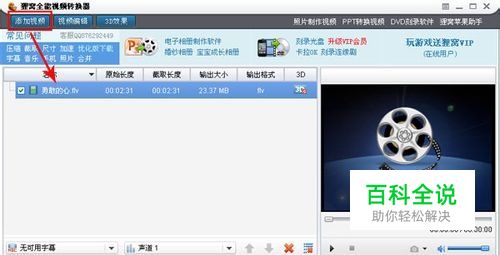 打开全能视频转换器,通过主界面的“添加视频”按钮,把flv格式的视频导入软件,还可以同时导入多个,软件可以支持批量转换、合并等。