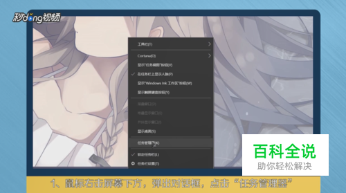 鼠标右击屏幕下方,弹出对话框,点击“任务管理器”。