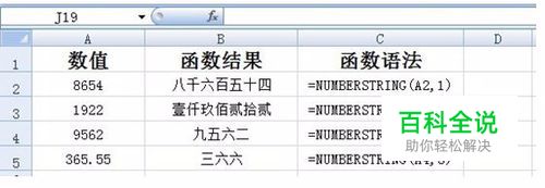 含义 NUMBERSTRING,此函数可以方便的实现小写数字到中文大写数字的转化,这个函数有两个参数: 第一个参数要转换的数值。 第二个参数指定返回的类型。 类型共有三种,其中,1为汉字小写,2为汉字大写,3为汉字读数。