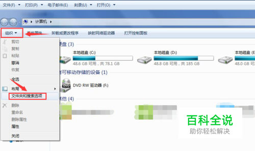 在打开的窗口中点击“组织”,然后在下拉菜单中点击打开“文件夹和搜索选项“。