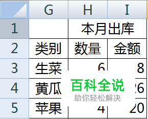 下一步,我们来统计进出库数量和金额。首先来统计出库数量和金额。 双击H3单元格,输入公式: =SUMIF(B$3:B$10,G3,C$3:C$10) 其目的是将B$3:B$10中与G3(“生菜”)相等的行对应的C$3:C$10数量进行合计。