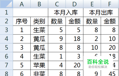 首先,看一下原始数据表。包括序号、类别、出入库数量和金额。其中某些类别在当月多次进出库,因此需要合并汇总。