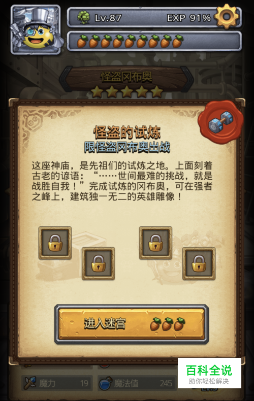 进图前,我们需要确认一下,怪盗冈布奥武器是否有买,喂食是否喂满。确定没问题后,让我们一起进入试炼吧。