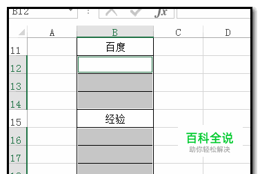 举个例子; 比如,图中,B12:B14要填充上B11的内容 ; B16:B20要填充B15内容