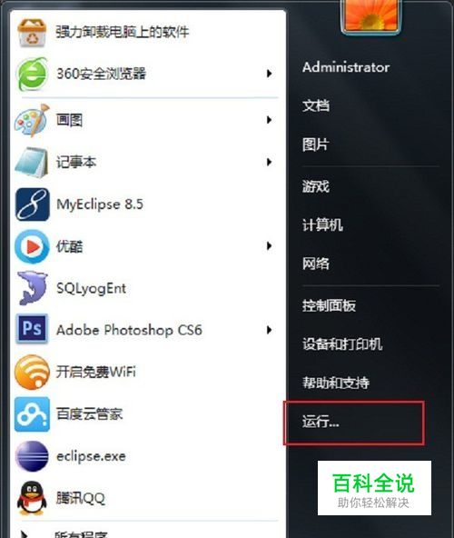 第一步点击开始菜单,找到“运行”,点击进去,也可以直接通过“win+R”打开运行,如下图所示: