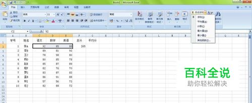然后我们要做出他们的总分,以及平均分。关于总分我们可以直接单击 开始栏中的自动求和,当然也可以去插入sum函数。选中要求和的三门功课,然后单击自动求和。