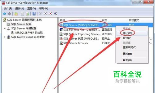 选择SQL Server服务,在右侧的SQL Server(MRSQLSERVER)选项上右击,选择“停止”。