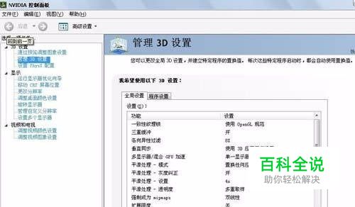 在桌面上点击“属性”后,选择进入“NVIDIA控制面板”;(有些为桌面鼠标右键,弹出的右键菜单内就有NVIDIA控制面板选项) 按照图中第一步选中“管理3D设置”,然后看到框内如下情形: