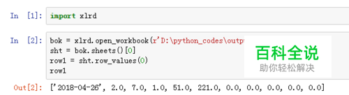 示例: import xlrd bok = xlrd.open_workbook(r'D:\python_codes\output.xlsx') sht = bok.sheets()[0] row1 = sht.row_values(0) cell_d4 = sht.cell(3,3).value
