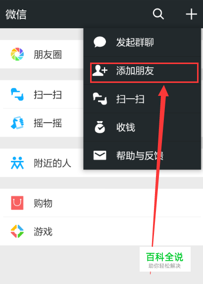 在我们点击打开+按钮后,我们看到在它选项下还有好几个功能选项,这里我们选择添加朋友的选项并点击打开。