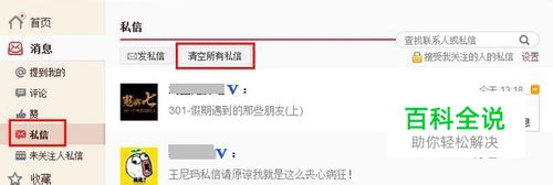 一:如果你想一键清除所有的私信信息,那么我们首先登陆微博,然后找到私信这一个功能,在打开“私信”新窗口里,我们在页面右上方可以找到“清空所有私信”这个选项卡,接着我选择它,并点击确认,这样就一键删除了所有私信。