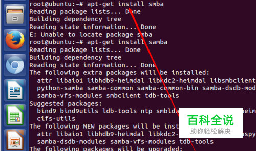 安装samba包,在root账户下输入命令:apt-get install samba。