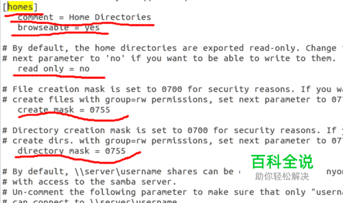 安装完成后,在root账户下打开配置文件:gedit /etc/samba/smb.conf。按照图示的位置更改。
