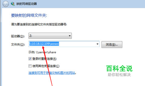 按图示格式输入\\[ip地址]\[user],点击完成。小编的ip是10.18.12.109,用户名是“wowo”,已经为其设置过密码了。参考第四步。