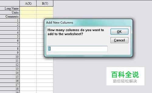 origin打开工作表后,一般只有A、B两列,默认A为X轴,B为Y轴。可以在此基础上添加列。使用快捷键“Ctrl+D”即可。在弹出的对话框中输入想要增加的列数。 也可以在菜单中找到“column”→“add new columns”