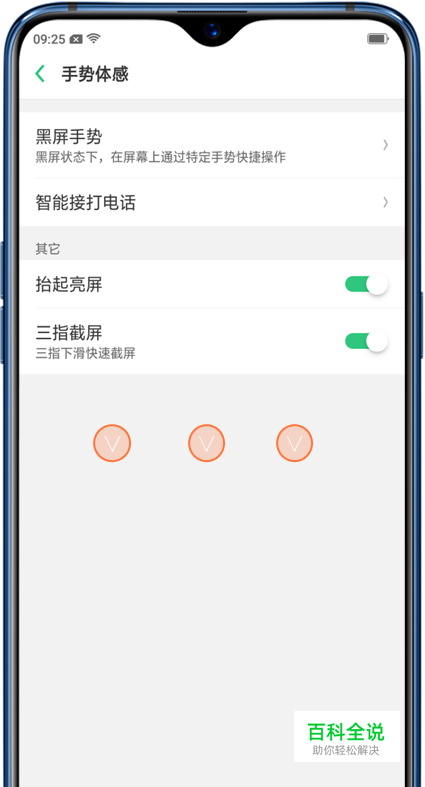 2、三指截屏: 在屏幕上使用三指向下滑动可进行截屏。 三指截屏默认开启,设置路径:手机设置--智能便捷--手势体感--三指截屏。