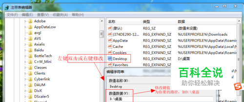 依次打开: HKEY_CURRENT_USER\Software\Microsoft\Windows\CurrentVersion\Explorer\ User Shell Folders在右边的键值中找到找到 Desktop右键(或左键双击)修改键值“%USERPROFILE%\桌面”为你要的路径(如D:\桌面),确定,关闭编辑器。