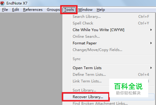 打开Endnote软件,依次点击菜单栏中的tool,选择recovery library选项