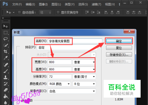 打开ps软件,新建一个800*800像素的白色画布,【命名为:字体填充背景图】方便保存之后查找,点击【确定】按钮。