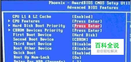 当我们进入“Advanced BIOS Features”设置界面以后,找到并按方向键将光标选择到“Hard Disk Boot Priority”,再按下回车键进入设置。如下图所示: 温馨提示:2009年以前的BIOS,“Advanced BIOS Features”下的这里的设置可能有些不同,可能会有“CPU Features”和“CPU L1&L2 Cache”这两个选项,不过设置方法还是相同。