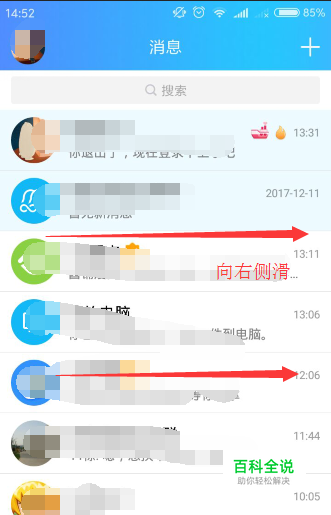 打开手机qq软件客户端,在主页面上,按照图中箭头的方向向右进行侧滑,侧边弹出的页面就是个人中心页面
