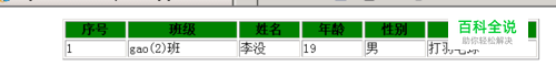 然后写htmL代码,整个表格,含表头,代码如下: <table border=1 width=600 height=30 align="center"> <tr bgcolor="green"> <th>序号</th><th>班级</th><th>姓名</th><th>年龄</th><th>性别</th><th>爱好</th> </tr>