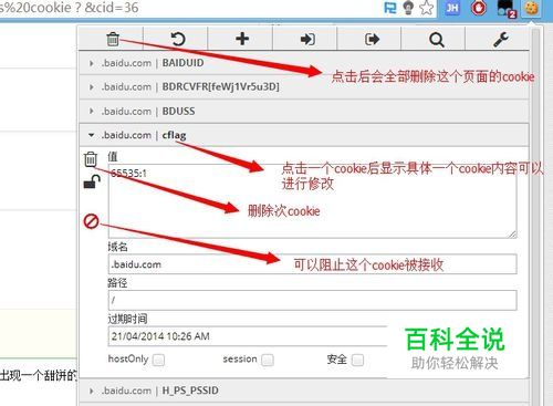 点击进入editthiscookie 编辑cookie页面后。如图所示: 点击最上面的垃圾箱,可以删除全部的cookie。 点击一个cookie后,可以进行单个cookie的删除,内容一般都可以修改,可以修改cookie的名称