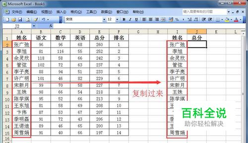 首先我们要弄明白vlookup函数的作用。该函数是按列查找,根据查找条件,最终返回查找列所对应的值。小编就以一个实例来说明vlookup函数的使用方法。该实例是要求从学校学生的成绩表中,按姓名列查询出总分列。如图所示,先把学生的姓名列复制。