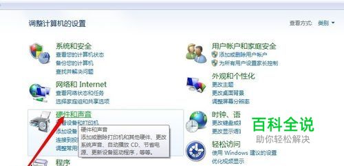 按照截图里红色箭头的指示,点击“硬件和声音”。进入如下界面。