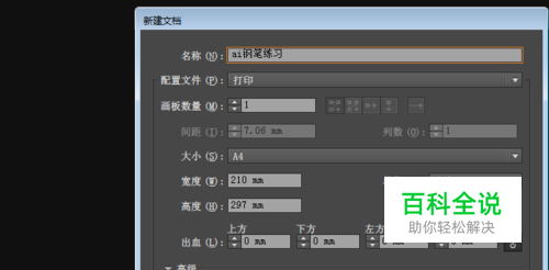 首先我们打开ai软件,按ctrl+n键,创建一个画板,命名为“ai钢笔练习”,点确定,如图所示