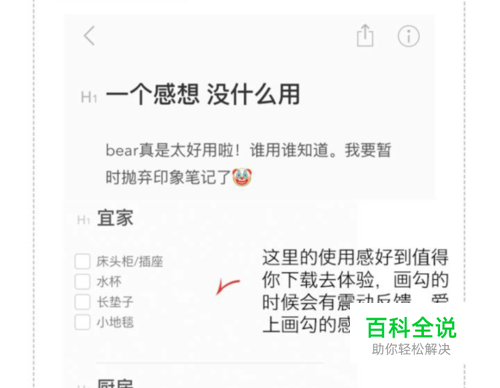 Bear 这个软件最好的一个地方就是里面的各种样式:下划线/加粗/不同大小的标题/备忘录的框/123的小角标,制作可以说是无敌精良了,变换样式的使用感及其舒适。 它不是没有缺点,缺点就是不能分类,特别是文件多了以后有些尴尬往下翻都不知道哪条是哪条。但是列表的体验真的是不要太好。想买的东西都用这个来标明,一件一件划掉后,超有成就感