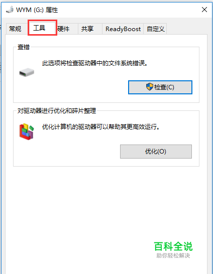 接着在打开的“属性”窗口中,切换至“工具”选项卡,点击“查错 开始检查”按钮。