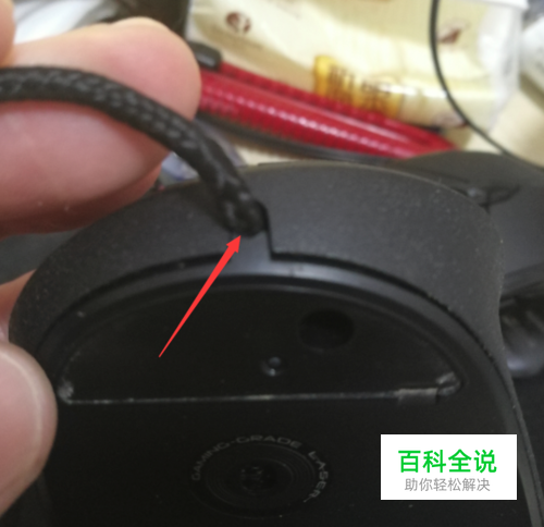 螺丝全部拆除后,感觉鼠标上下壳还挺紧,我是拿稳上壳,直接把线往下拽,这样壳就分开了,如图: