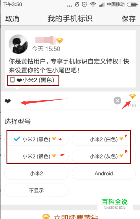 首先想要自己设置自己想要的手机型号或者在前面加上表情或者一句话,就必须先开通QQ空间的黄钻特权,才有权限设置。 【如图所示,没有开通黄钻的用户只能选择原有机型,或者同意的系统型号】